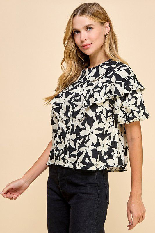 FLORAL BUTTON DOWN RUFFLE DETAIL BLOUSE